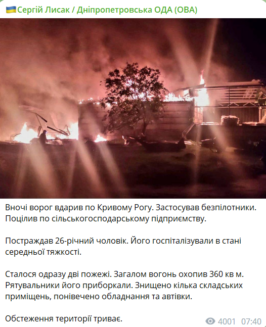 Ночью 8 июля беспилотники ударили по Кривому Рогу. Повреждено сельскохозяйственное предприятие, ранен мужчина.