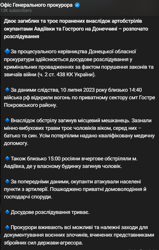 По данным следствия, около 14:40 войска РФ открыли огонь по частному сектору пгт Острое в Покровском районе. В результате обстрела погиб местный житель. Трое мужчин, включая отца и сына, получили минно-взрывные травмы.