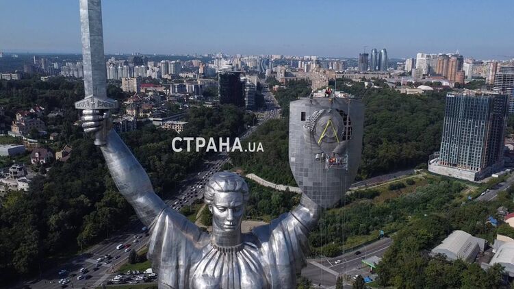 В Киеве продолжают демонтировать советский герб с монумента "Родина-Мать". Видео