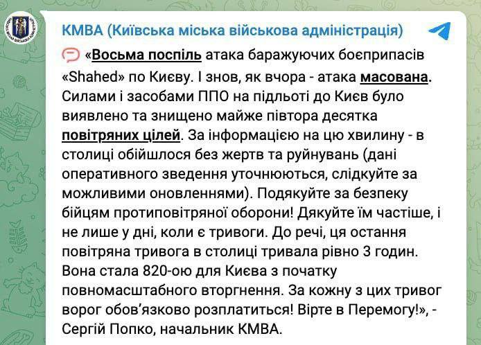 Последняя воздушная тревога в столице продолжалась три часа. Она стала 820-й для Киева с начала полномасштабного вторжения.