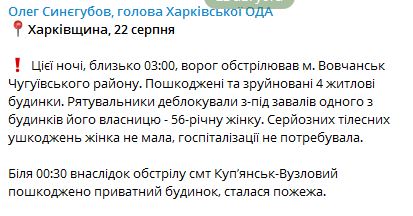 Об этом сообщает глава Харьковской ОВА Олег Синегубов.