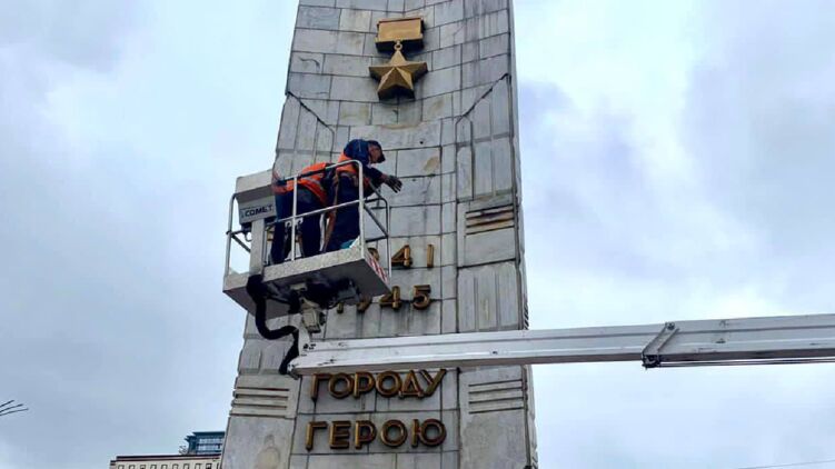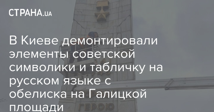 В Киеве демонтировали элементы советской символики и табличку на русском языке с обелиска на Галицкой площади