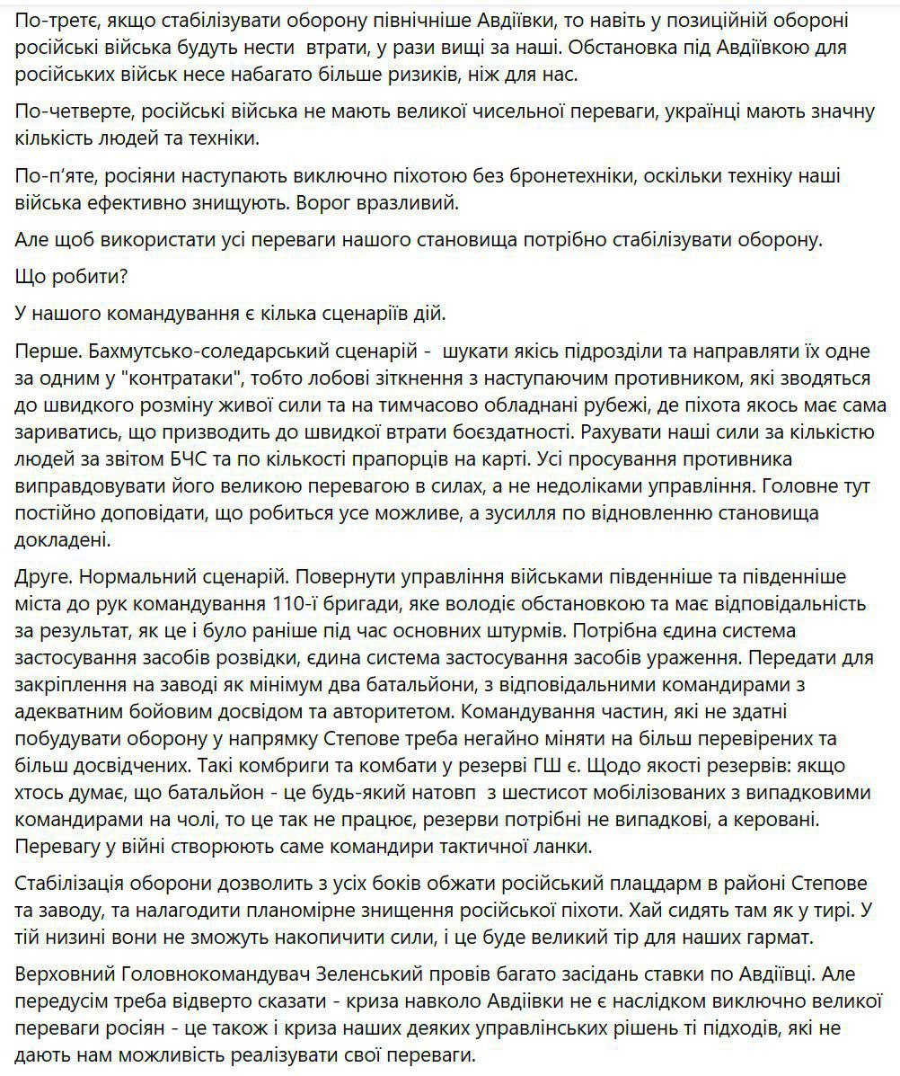 По его словам, "за время войны в Авдеевке ни один руководитель не построил тыловую линию обороны, и окапываться нужно сейчас, готовых позиций нет" (ранее о том же говорил и экс-советник Банковой Алексей Арестович).