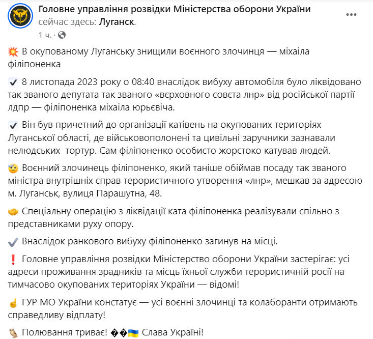 Главное управление разведки Минобороны взяло на себя ответственность за подрыв военного преступника Михаила Филипоненко в оккупированном Луганске.