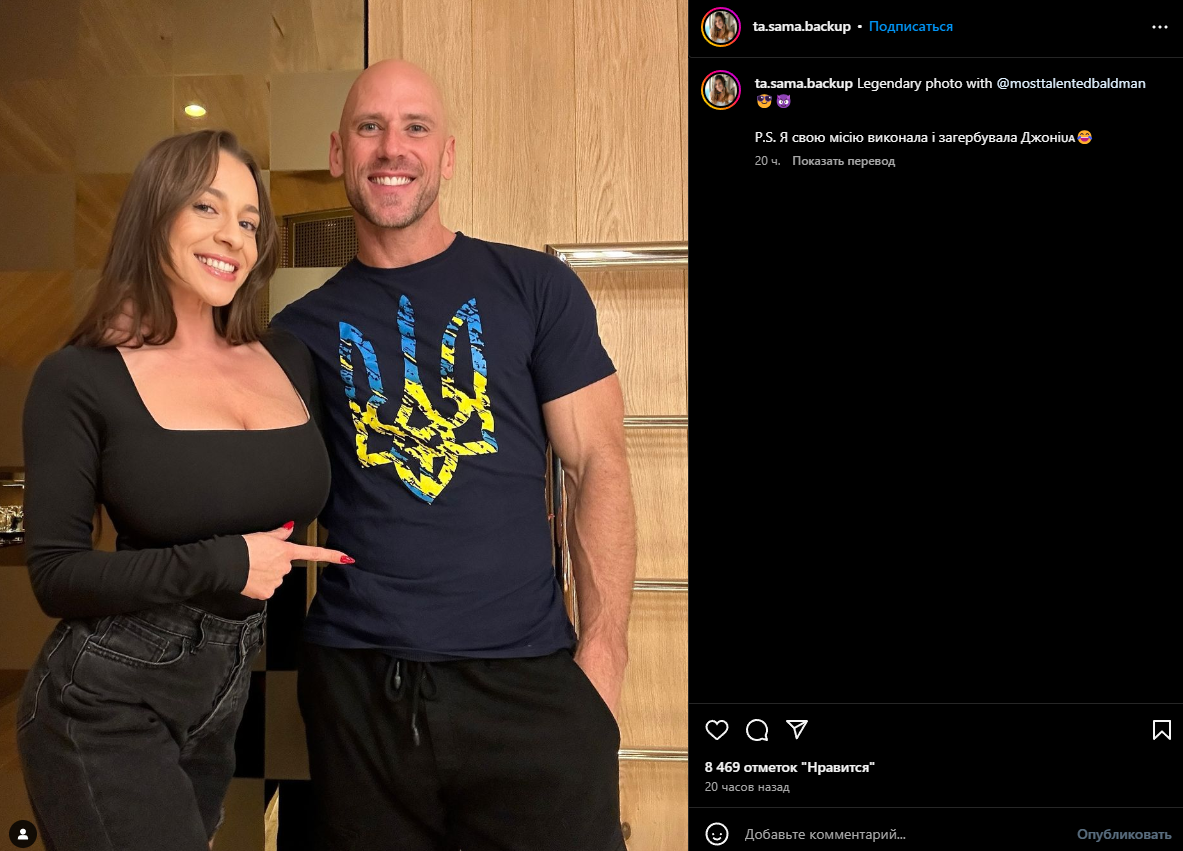 Порноактер Джонни Синс, известный как лысый из Brazzers (название известной порностудии), сфотографировался в футболке с гербом Украины. Футболку ему подарила украинская порноактриса Юлия Сенюк, прославившаяся в индустрии под псевдонимом Джозефина Джексон.