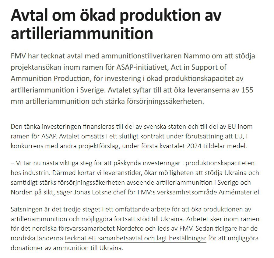 "Сейчас мы делаем следующий важный шаг, чтобы ускорить инвестиции в производственные мощности отрасли. Это сократит сроки поставок, повысит нашу способность оказывать поддержку Украине и в то же время укрепит надежность поставок артиллерийских боеприпасов в Швеции и Северном регионе в долгосрочной перспективе", - объяснил руководитель направления вооружений ведомства Йонас Лоцне.