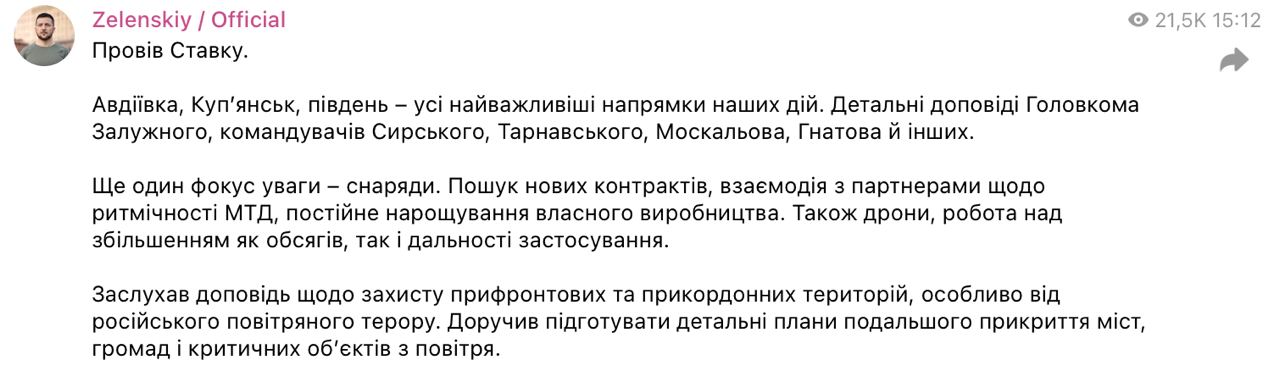 1. Сообщил о заседании Ставки по ситуации на фронте. Назвал наиболее интенсивными Авдеевское, Марьинское и Купянское направления. Также обсуждали снабжение фронта снарядами и защиту от воздушных атак.