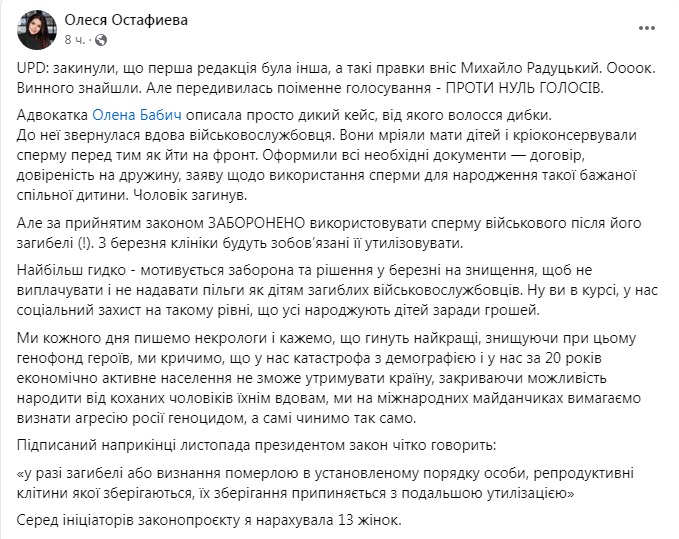 Интересно, что, по информации Остафиевой, именно Радуцкий является автором поправки об утилизации спермы умерших, внесенной в закон.