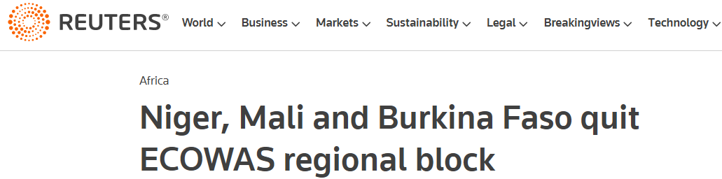 Буркина-Фасо, Нигер и Мали объявили о выходе из Экономического сообщества стран Западной Африки (ЭКОВАС).