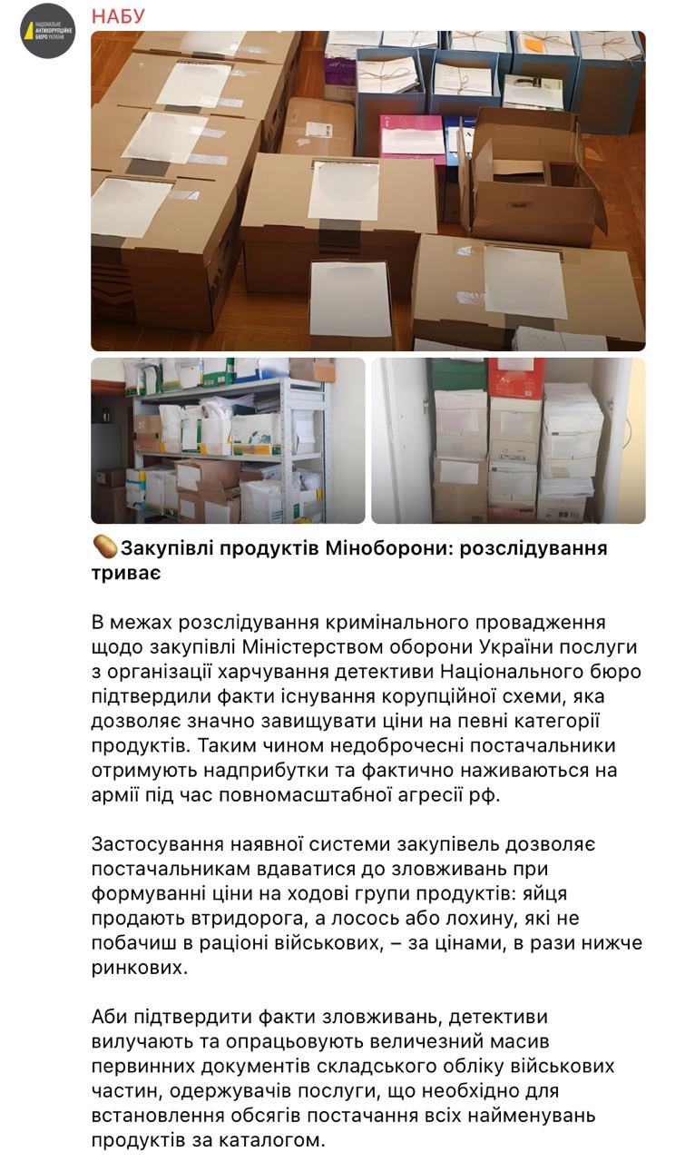 НАБУ подтверждает факт существования коррупционной схемы, которая позволяет значительно завышать цены при закупке продуктов в Минобороны.