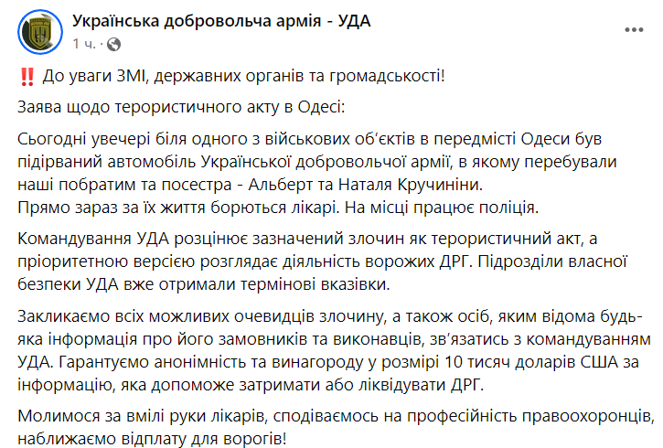 В свою очередь Украинская добровольческая армия на своей странице в Фейсбуке подтвердила личности пострадавших и заявила, что взрыв ее автомобиля, в котором находился активист "Правого сектора" Альберт Кручинин с женой Натальей, - это теракт.