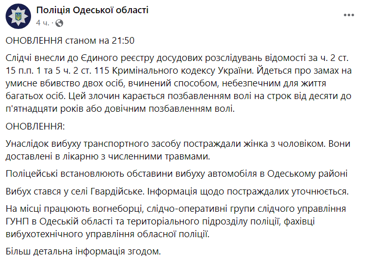 Вечером 19 февраля в поселке Гвардейское Одесской области взорвался автомобиль, в котором находились мужчина с женщиной.