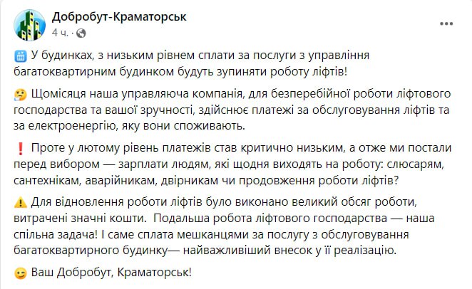 Об этом сообщает управляющая компания "Добробут-Краматорск" на своей странице в Фейсбуке.