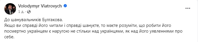 Этот вопрос задал пользователь под постом Вятровича, в котором нардеп заявил, что сам Булгаков не считал себя украинцем и "делать его посмертно украинцем является надругательством не столько над украинцами, сколько над его представлениями о себе".