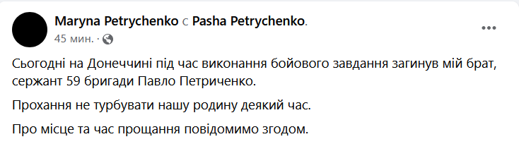 "Сегодня в Донецкой области во время выполнения боевого задания погиб мой брат, сержант 59 бригады Павел Петриченко. Просьба не беспокоить нашу семью некоторое время. О месте и времени прощания сообщим впоследствии", - написала она.
