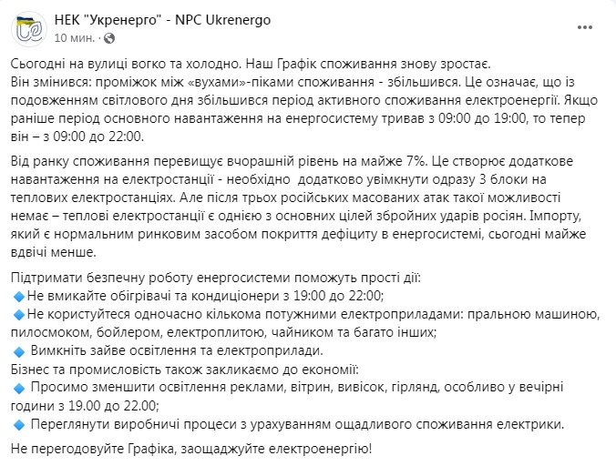 "С утра потребление превышает вчерашний уровень почти на 7%. Это создает дополнительную нагрузку на электростанции – необходимо дополнительно включить сразу три блока на тепловых электростанциях. Но после трех российских массированных атак такой возможности нет", – объяснила компания.