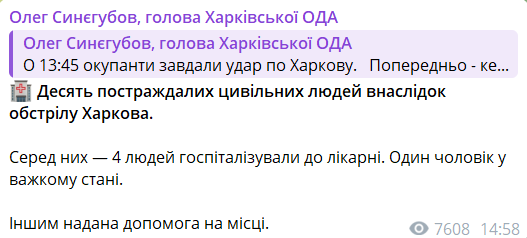 "Десять пострадавших гражданских людей в результате обстрела Харькова. Среди них 4 человека госпитализировали в больницу. Один человек в тяжелом состоянии", - написал Синегубов.