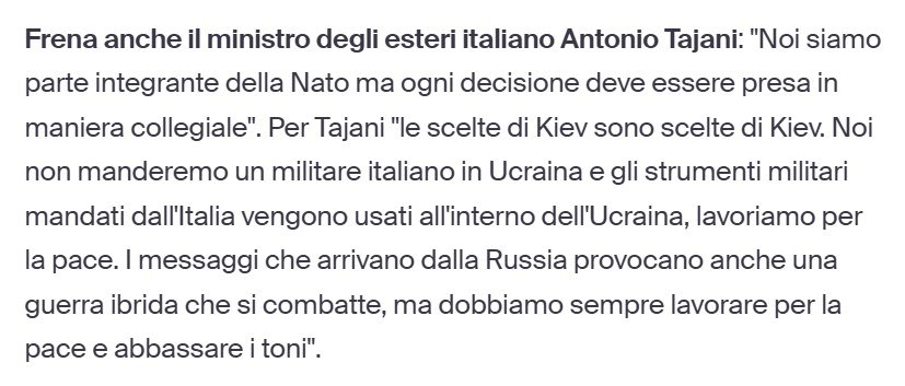 "Выбор Киева – это выбор Киева. Мы не отправим итальянского солдата в Украину, и военные инструменты, отправленные Италией, будут использоваться внутри Украины, мы работаем ради мира", - заявил отвечающий за внешнюю политику замглавы правительства Антонио Таяни.