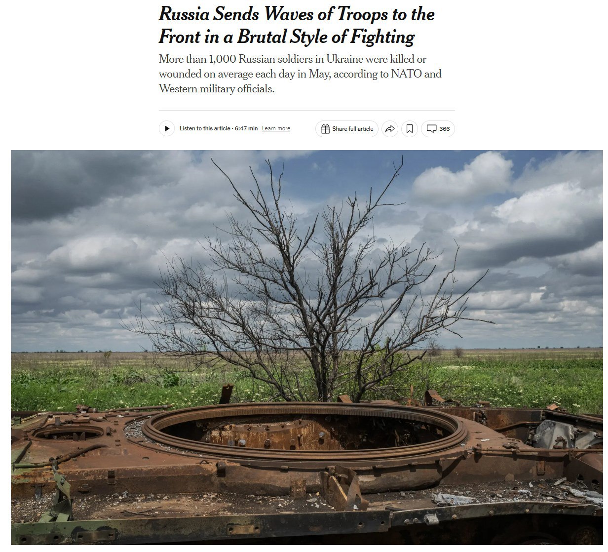 Россия набирает от 25 000 до 30 000 новых солдат в месяц. Это позволяет компенсировать примерно аналогичные потери, которые в мае составляли примерно по тысяче человек в день убитыми и ранеными.