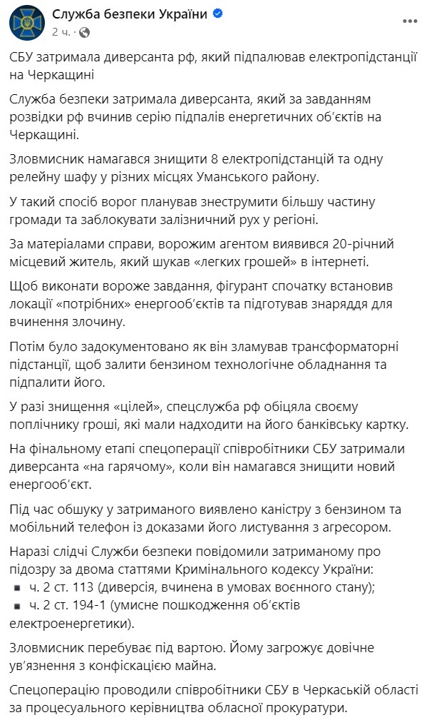 Сообщается, что 20-летний местный житель пытался уничтожить 8 электроподстанций и один релейный шкаф в разных местах Уманского района по заказу РФ.