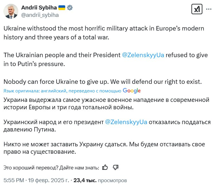 "Украина выдержала самое ужасное военное нападение в современной истории Европы и три года тотальной войны. Украинский народ и его президент Зеленский отказались поддаться давлению Путина. Никто не может заставить Украину сдаться. Мы будем отстаивать свое право на существование", – написал министр иностранных дел.