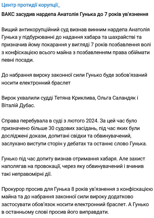 Высший антикоррупционный суд (ВАКС) Украины приговорил народного депутата Анатолия Гунько к семи годам тюремного заключения.