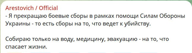 "Я прекращаю боевые сборы в рамках помощи Силам обороны Украины – то есть сборы на то, что ведет к убийству. Собираю только на воду, медицину, эвакуацию – на то, что спасает жизни", – написал экс-советник Офиса президента, против которого недавно ввели санкции.