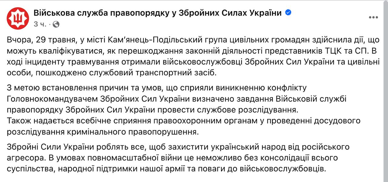 А главком Александр Сырский поручил Военной службе правопорядка ВСУ расследовать причины и условия массового конфликта гражданских с ТЦК в Каменце-Подольском, сообщает ВСП.