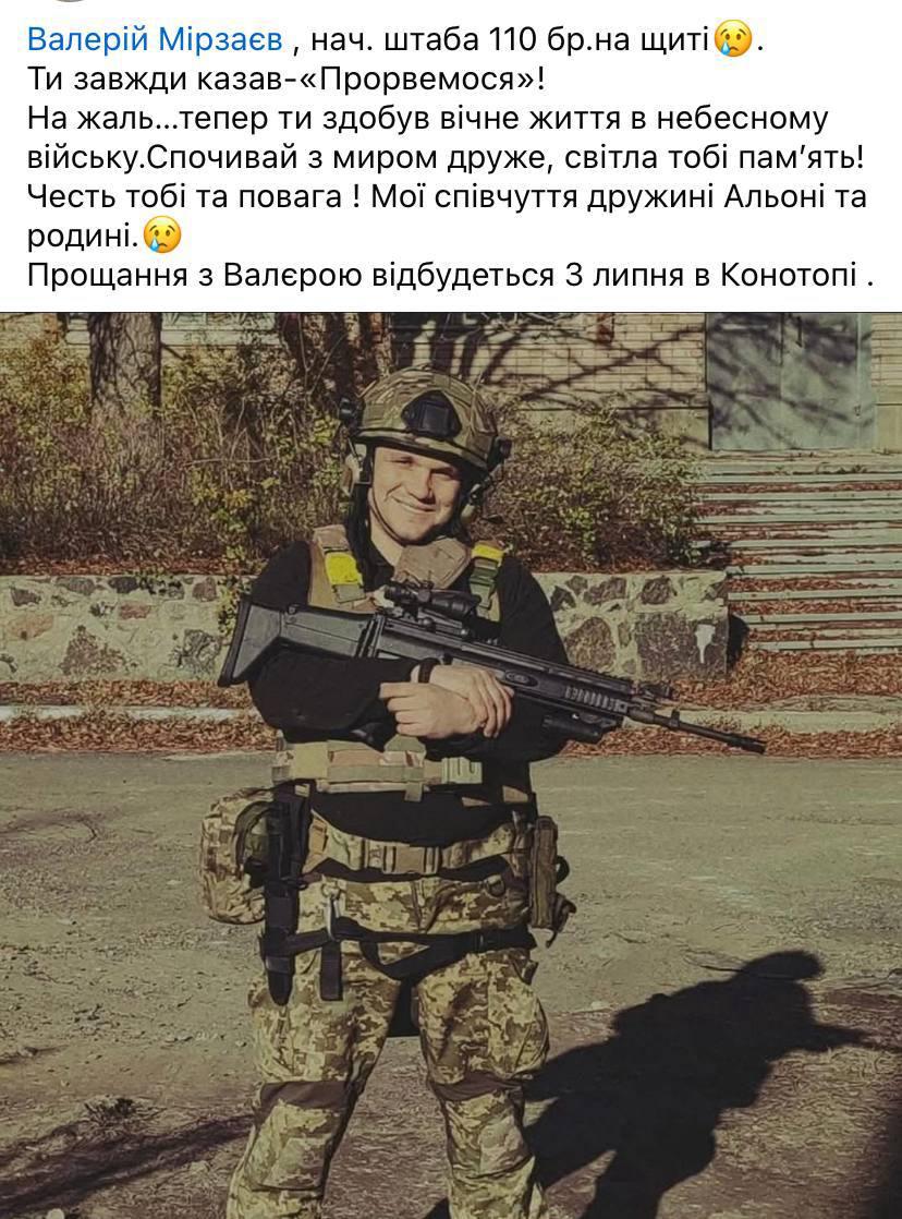 Во вторник, 1 июля, погибли заместитель командира 110-й отдельной механизированной бригады имени генерал-хорунжего Марка Безручко Дмитрий Романюк и начальник штаба этого подразделения Валерий Мирзаев.