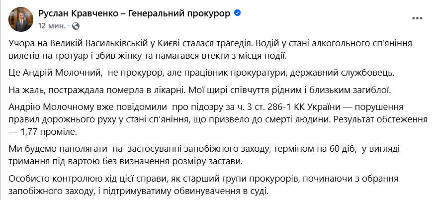 Об этом сообщил генпрокурор Руслан Кравченко.