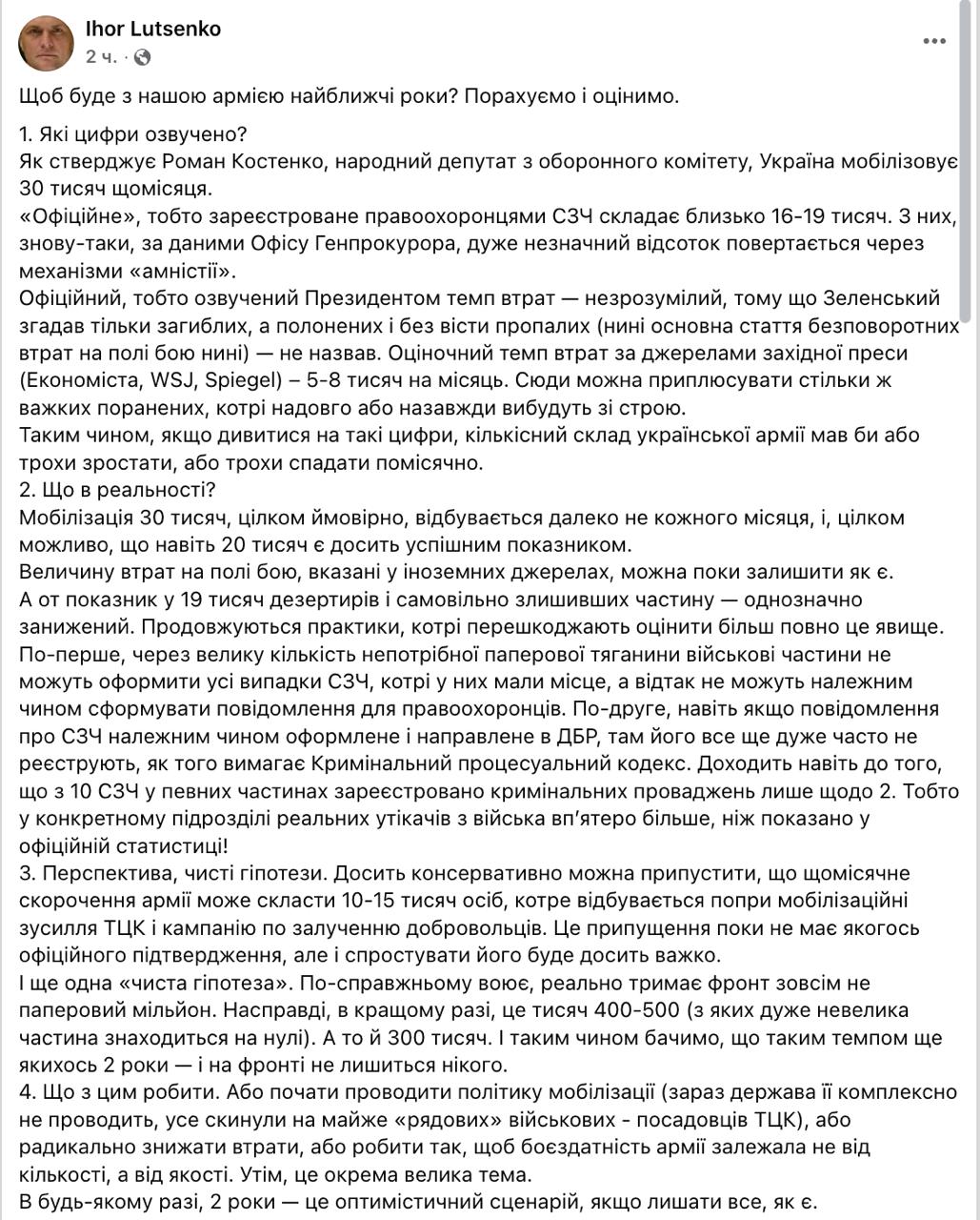 "Довольно консервативно можно предположить, что ежемесячное сокращение армии может составлять 10–15 тысяч человек. Ещё одна "чистая гипотеза": реально воюет, реально держит фронт - вовсе не "бумажный миллион". На деле, в лучшем случае, это 400–500 тысяч (из которых лишь малая часть находится на "нуле"). А возможно - и 300 тысяч. И при таком темпе через какие-нибудь два года - на фронте не останется никого. Это оптимистичный сценарий, если всё оставить как есть", - пишет Луценко.