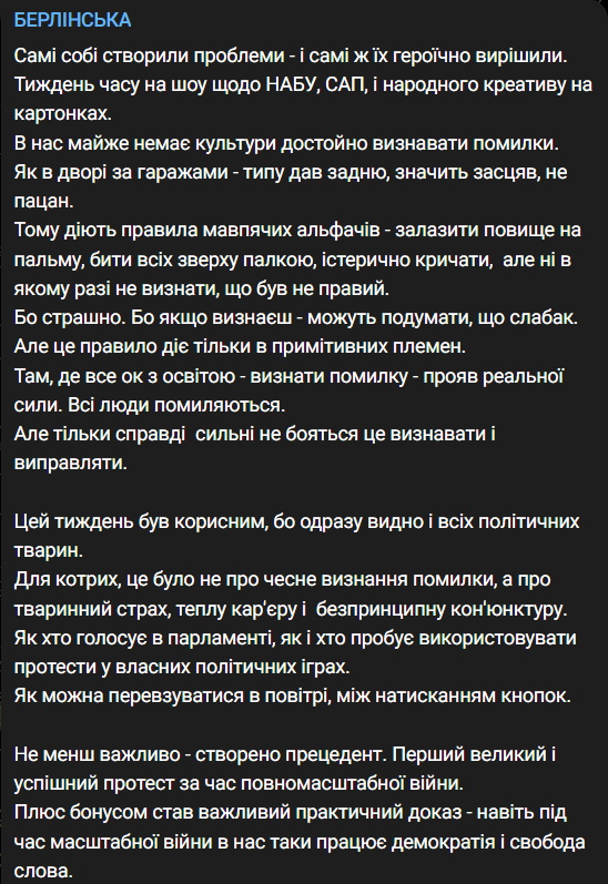 "Даже если эту цифру сразу разделить на два (легкораненые возвращаются, часть из СЗЧ тоже) - все равно будет впечатляющая цифра. Минус 159 000 в год. И никакой миллионной армии у нас давно нет, кстати. Враг идет ориентировочно в плюс 9-10 тысяч в месяц. То есть плюс 120 тысяч в год. И это еще никакой мобилизации они толком даже не начинали. Пока мы считаем, сколько депутатов меняют позицию за неделю. Пора считать, сколько депутатов останутся в Киеве, когда враг снова будет стоять под столицей. Если мы ничего не изменим, это вполне может произойти уже этой зимой", - резюмирует Берлинская.