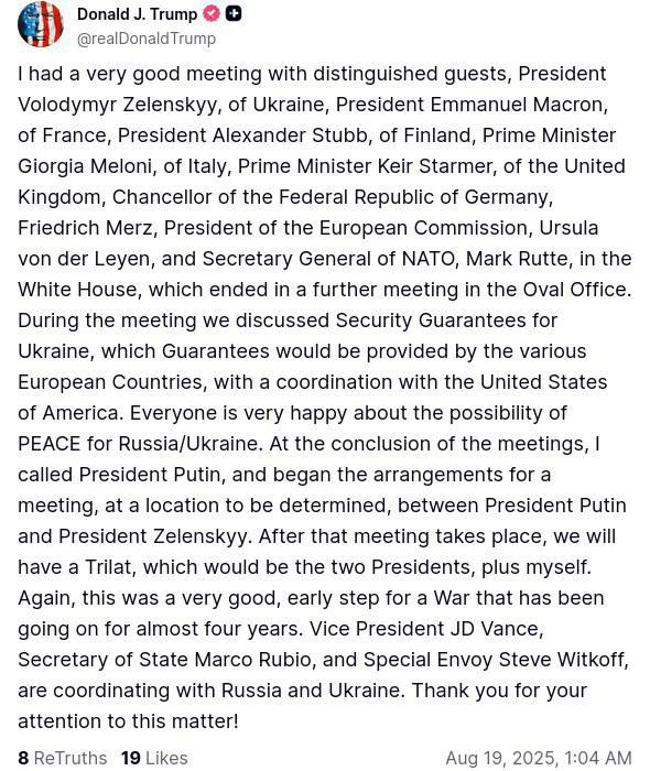 "Во время встречи мы обсудили гарантии безопасности для Украины, которые будут предоставлены различными европейскими странами в координации с Соединёнными Штатами Америки. Все очень довольны возможностью достижения мира между Россией и Украиной. По завершении встречи я позвонил президенту Путину и начал организацию встречи, место проведения которой ещё предстоит определить, между Путиным и Зеленским. После этой встречи состоится трёхсторонний формат — два президента и я.