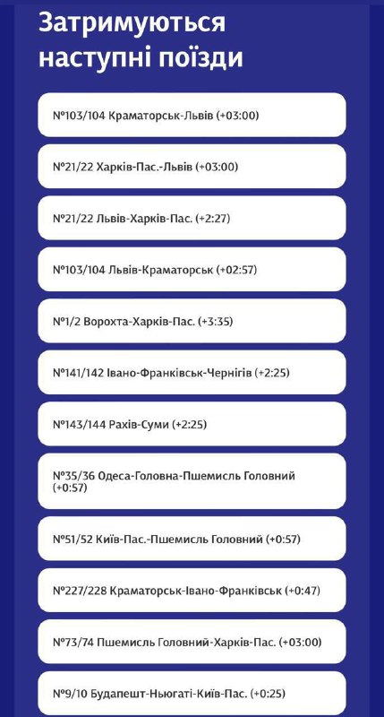 "В результате ночного вражеского обстрела и повреждения железнодорожной инфраструктуры в Киевской области ряд поездов задерживается и прибудет на станцию Киев с опозданием от 2 часов", - сообщает "Укрзализныця".