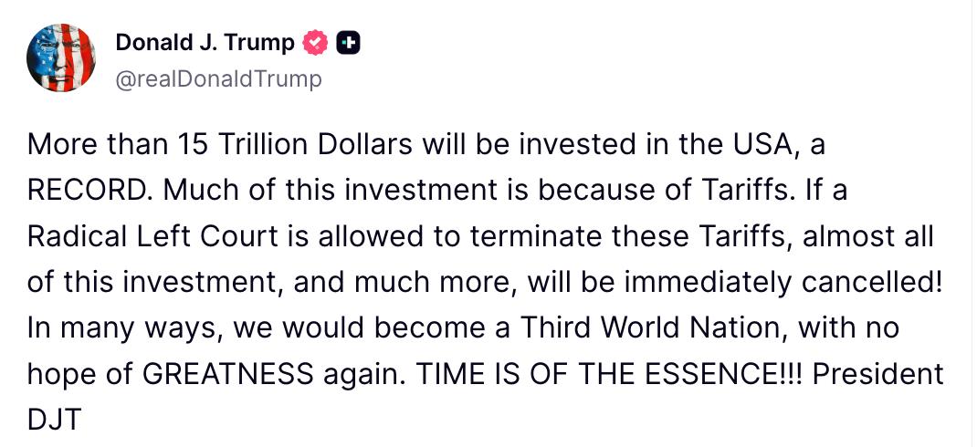 "В США будет вложено более 15 триллионов долларов - это рекорд. Значительная часть инвестиций обеспечена благодаря тарифам. Если радикальный левый суд отменит их, почти все эти вложения и многое другое будут немедленно отменены. Во многом мы превратимся в страну третьего мира, без надежды снова стать великой. Время имеет решающее значение!" - написал он.