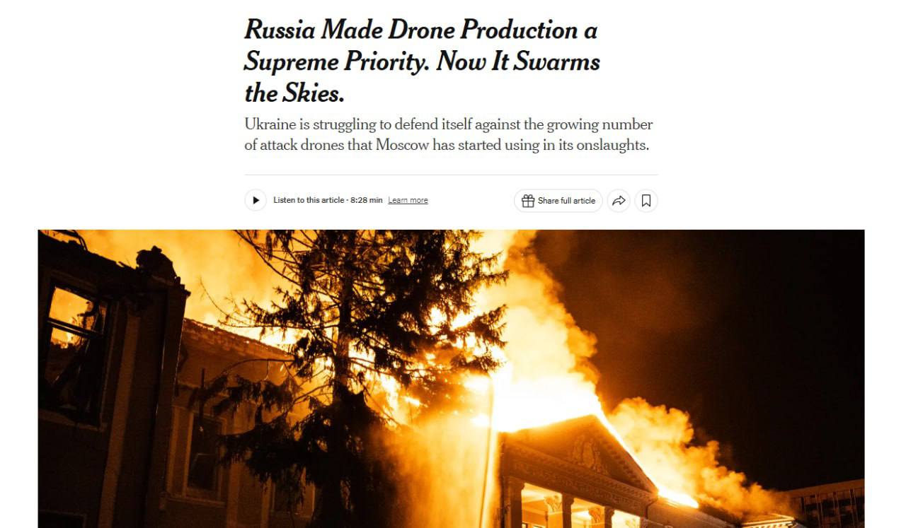 Об этом говорится в статье The New York Times, посвященной проблеме беспилотников атакующих Украину.