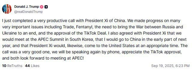 "Я только что провёл очень продуктивный звонок с председателем Китая Си Цзиньпином. Мы добились прогресса по многим важным вопросам, включая торговлю, проблему фентанила, необходимость положить конец войне между Россией и Украиной, а также одобрение сделки по TikTok. Мы также договорились, что встретимся на саммите АТЭС в Южной Корее, я поеду в Китай в начале следующего года, а председатель Си, в свою очередь, приедет в США в подходящее время. Звонок прошёл очень хорошо, мы продолжим общаться по телефону, я ценю одобрение сделки по TikTok, и мы оба с нетерпением ждём встречи на АТЭС!" – написал президент США.