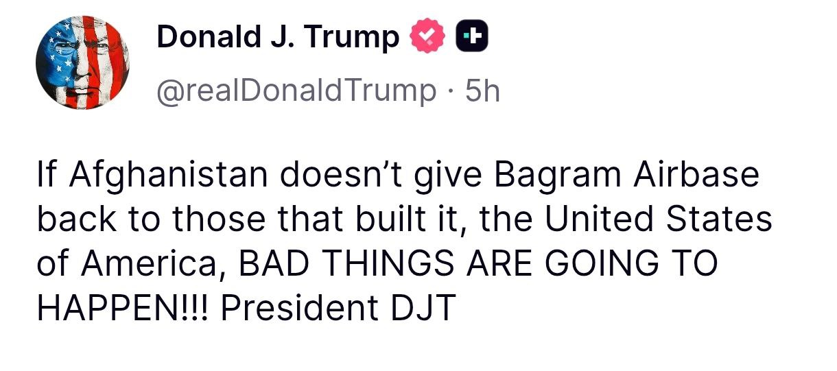 "Если Афганистан не вернёт авиабазу Баграм тем, кто её построил, Соединённым Штатам Америки, произойдут плохие вещи!" - написал он.