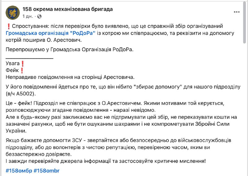 Военные заявили, что после проверки было выявлено, что объявленный Арестовичем сбор настоящий, он организован общественной организацией "РоДоРа" (сокращение от "Робимо добро разом"), с которой бригада сотрудничает. Аутентичными являются и реквизиты для помощи, которые опубликовал Арестович.