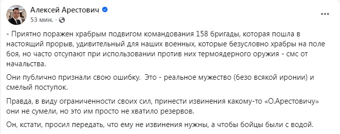 Они публично признали свою ошибку. Это - реальное мужество (безо всякой иронии) и смелый поступок. Правда, ввиду ограниченности своих сил принести извинения какому-то Арестовичу они не сумели, но это им просто не хватило резервов", - написал бывший советник Банковой.