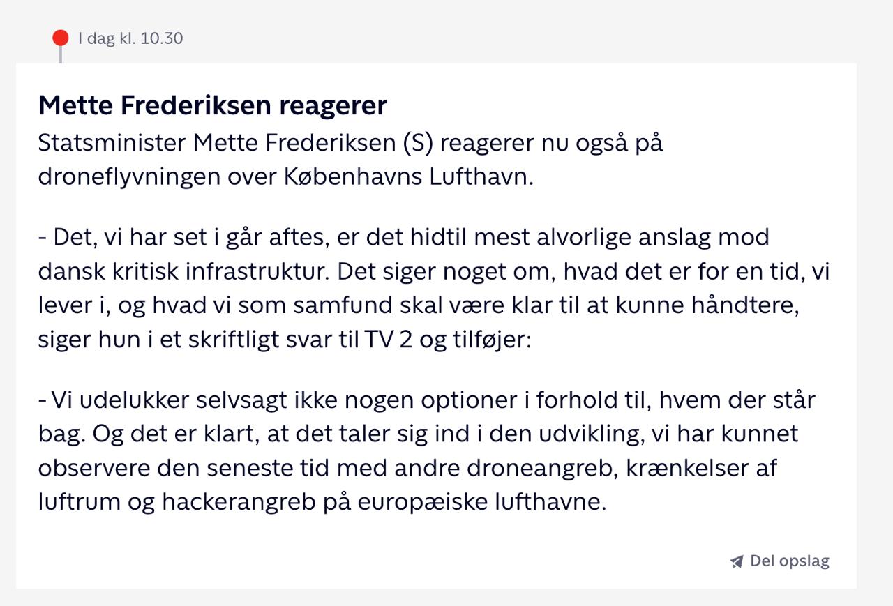 Между тем власти Дании пока не знают, чьи дроны к ним залетели, но подозревают в их запуске Россию. Премьер-министр страны Метте Фредериксен на вопрос журналистов TV2, подозревает ли она в причастности к полету БпЛА Москву, ответила: "В любом случае я никоим образом не могу отрицать, что это Россия".
