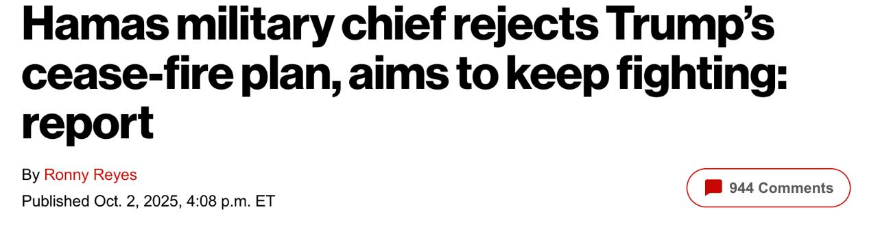 Высший военный лидер ХАМАС Эзз аль-Дин аль-Хадад отверг мирный план президента США Дональда Трампа. Он считает его способом ликвидации ХАМАС без достижения каких-либо их целей.