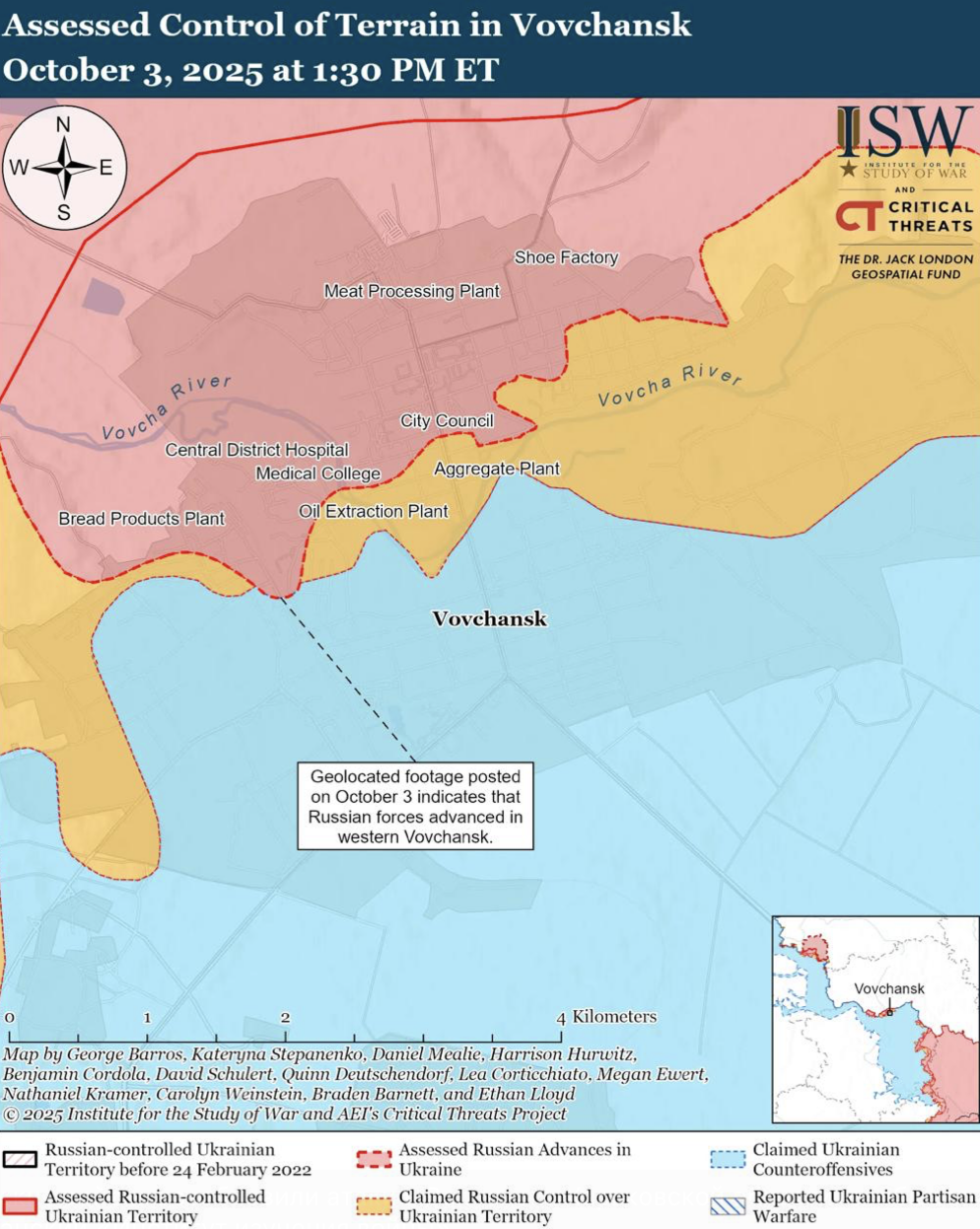 "Геолокационные кадры, опубликованные 3 октября, указывают, что российские силы недавно продвинулись вдоль Южной железной дороги в западной части Волчанска и захватили Волчанский железнодорожный вокзал", - говорится в сводке "Института".
