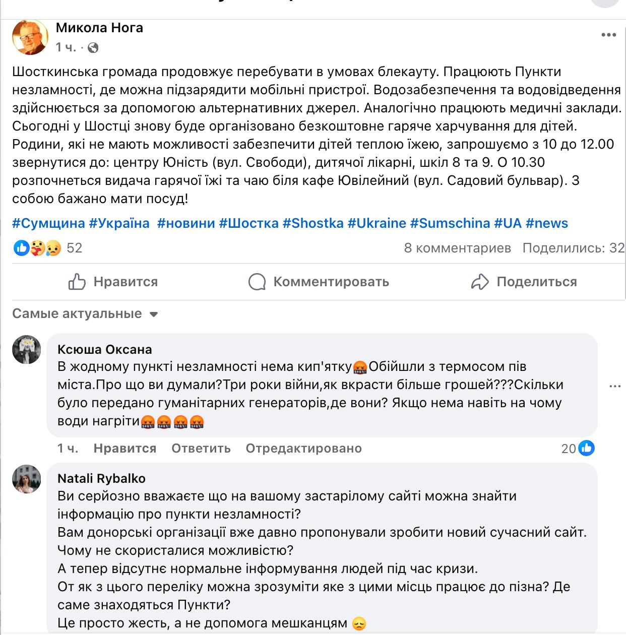 10:23 В Шостке, которую вчера атаковали, по-прежнему нет света, а воду дают по графику, сообщил мэр Николай Нога.