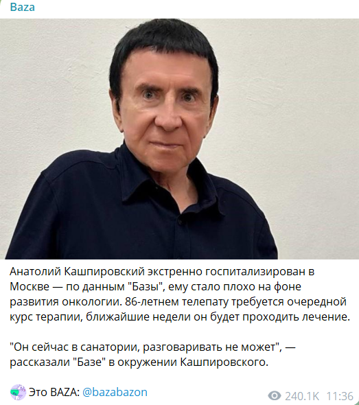 По их информации, 86-летний Кашпировский долгое время страдал от болей в брюшной полости, но отказывался обращаться к врачам за помощью. Он пытался вылечить рак своими методами, но это не помогло, его здоровье резко ухудшилось.