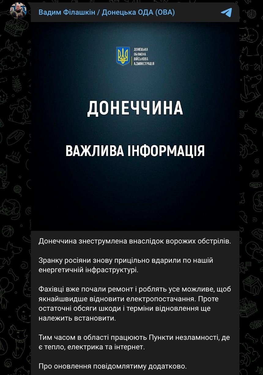 8:21 Донецкая область (подконтрольная Украине часть) осталась без света после утреннего удара по энергетике.