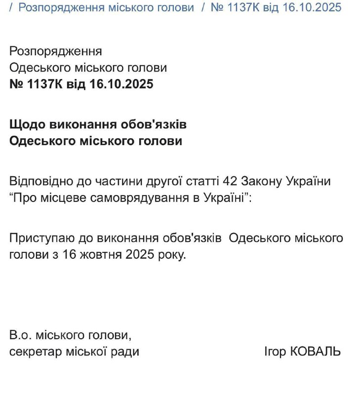 "В соответствии с частью второй статьи 42 закона Украины "О местном самоуправлении в Украине" приступаю к исполнению обязанностей одесского городского главы с 16 октября 2025 года", - сказано в документе.