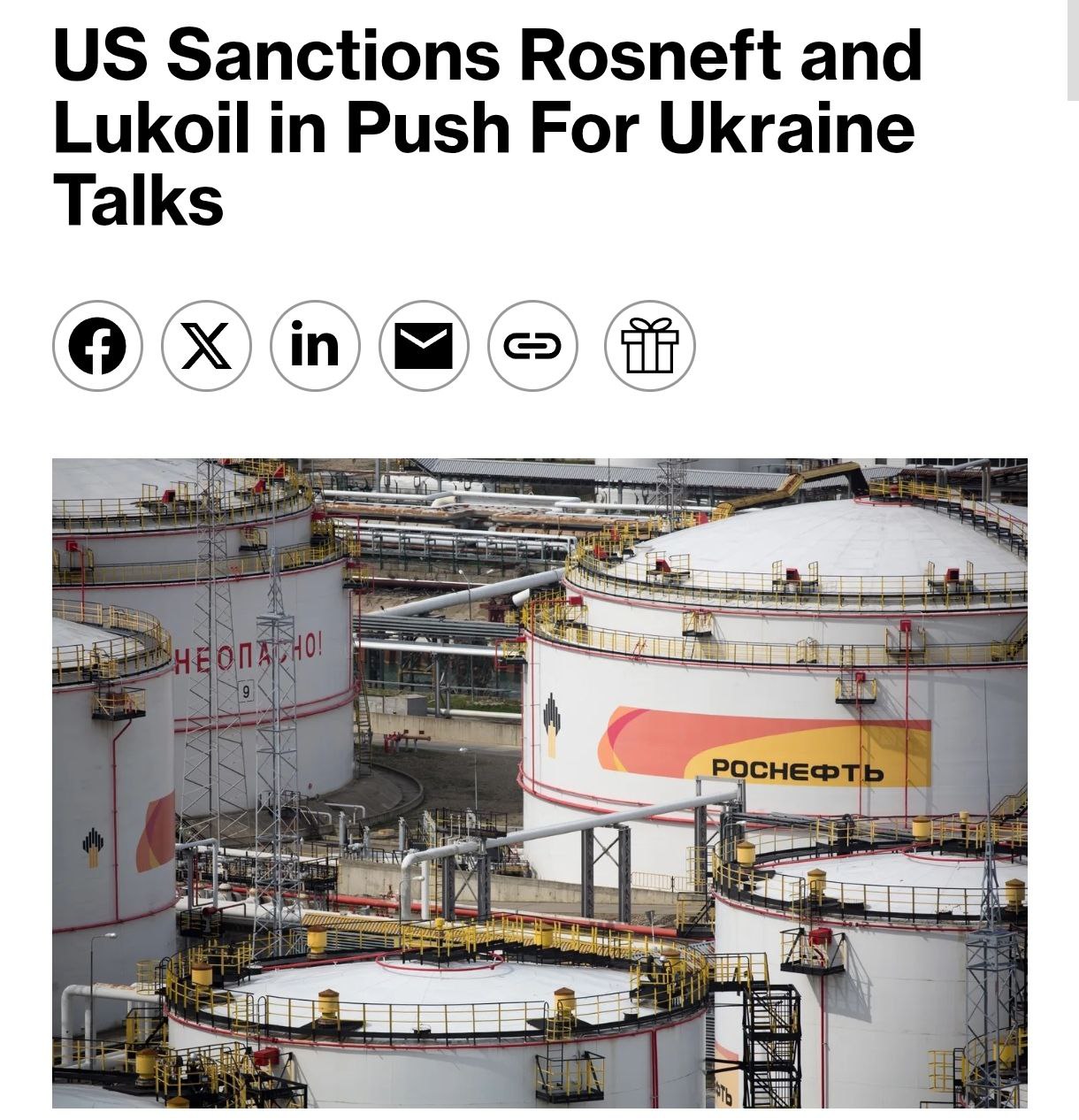 Цены на нефть резко выросли на фоне сообщений о санкциях США против "Лукойла" и "Роснефти".
