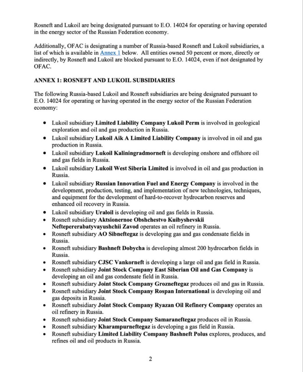 Все активы и имущественные интересы "Роснефти" и "Лукойла", находящиеся в США или под контролем американских лиц, блокируются. Любые операции с участием этих компаний запрещены для граждан и юридических лиц США, а также для всех транзакций, проходящих через американскую финансовую систему (отметим, что один из крупнейших покупателей российской нефти - Индия - платит за топливо в юанях).
