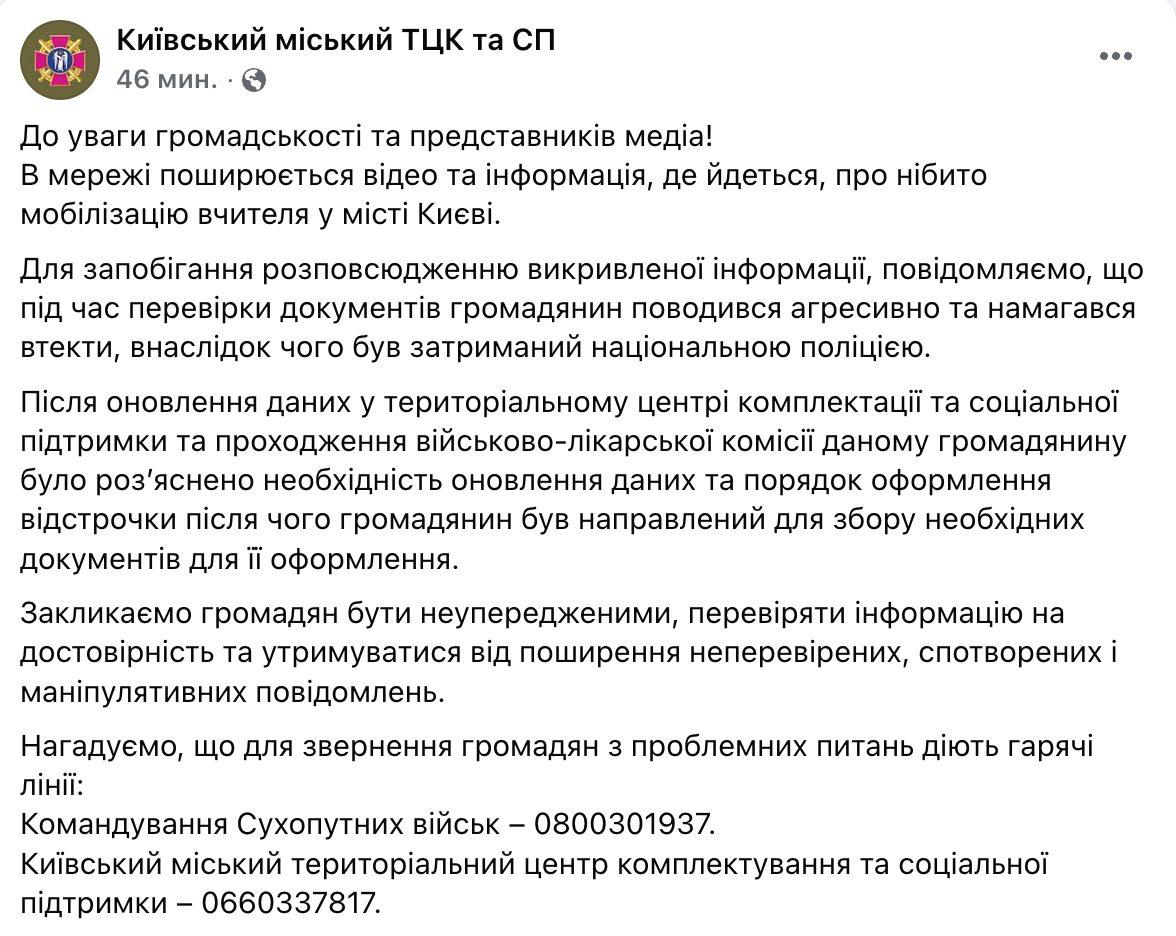 12.44 В Киевском городском ТЦК заявили, что мобилизованный учитель физкультуры "пытался скрыться и вел себя агрессивно", поэтому и был задержан. У него не было отсрочки, но после медкомиссии его отпустили для ее оформления.